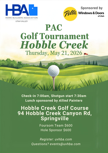 PAC Golf Tournament at Hobble Creek Share: Name: PAC Golf Tournament at Hobble Creek Date: May 21, 2026 Registration: Register Now Event Description: Friends of Housing PAC Golf Tournament sponsored by Pella Windows and Doors of Utah To Current Calendar Event Sponsors: Title Sponsor Lunch Sponsor Hole Sponsors Location: Hobble Creek Golf Course 94 Hobble Creek Canyon Rd Springville, UT 84663 Date/Time Information: Thursday, May 21, 2026 Registration 7:00am, Shotgun Start 7:30am Contact Information: Send an Email Fees/Admission: To sponsor a hole, driving range, breakfast, or lunch please email events@uvhba.com Hole Sponsor $600 (all hole sponsors must donate a $75+ gift for lunch raffle) Breakfast $600 + provide breakfast Lunch $1000 Driving Range $600 Set a Reminder: Enter your email address below to receive a reminder message. -- Select Days Before Event -- 1 Day 2 Days 3 Days 1 Week Captcha Validation Please complete the Captcha To Current Calendar